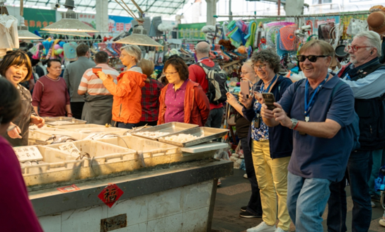 去年4月,上钢集贸市场还被纳入邮轮客上海特色旅游线路,双语服务、热情摊主、浓厚市井氛围,让它成了外国游客喜爱的“烟火气新地标”。“得知要纳入旅游线路,我们市场立刻组织起双语标识突击队,短短几天就在门头、厕所、出入口增设了56处中英文标识。” 胡海波回忆道,更让人暖心的是摊主们的主动参与:卖葱姜的周阿婆特意学了 “Welcome to Shanghai”,见到外国游客就热情打招呼;水产摊位的老张每天仔细清洁摊位,生怕影响游客体验;水果摊的小王还自己制作了英文价签,方便游客挑选。“这就是国际化上海的烟火气,接地气又有温度。”