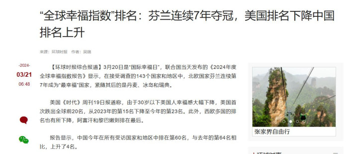 再看生活质量。人均GDP上去了,并不代表人民生活也达到了同等水平。《2024年全球幸福报告》中,中国排名第60位,远低于收入相当的国家。
